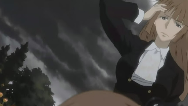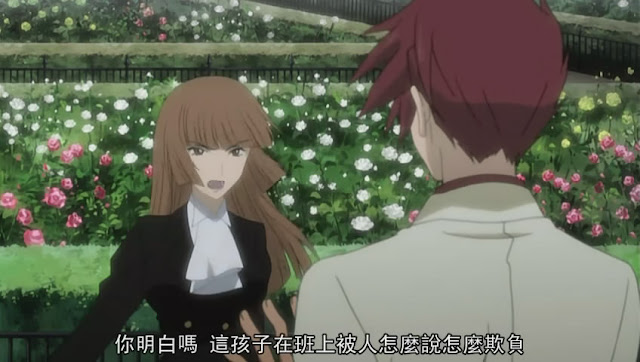 5’46” 玫瑰庭院中的嘉音展现出对谁都一脸冷漠的表情,被乡田责备不够热情。朱志香慌慌忙忙地在一边打圆场,战人也表示理解嘉音的性格。